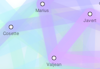 The table to the right shows node membership: each node's presence in each color-coded community is shown by a colored tile. It's sorted with the most-connected nodes at the top (e.g. Valjean, Dorothy), and color intensity shows "dilution" across multiple memberships. The columns are shown and color-coded in their clustering order, so you'll find similar communities in adjacent columns and colors.