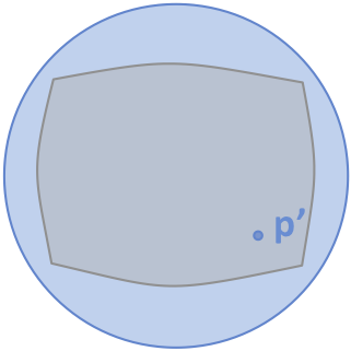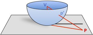 Next we drop a fisheye lens on the plane. We have control over the radius of the lens and where we place it; these are important parameters which affect the final image. Point p' is the projection of P onto the surface of the lens, as seen from a viewer at the center of the lens V. The lens should have zero slope where it contacts the plane, so that objects directly under it are rendered smoothly. The lens should be a monotonic curve without creases or folds. Also the height of the viewpoint V defines the rim of the lens: nothing above the rim matters, since the rim projects to infinity. In other words, no matter how far away point P is, if it's in the gray plane of the data, it's guaranteed to have a unique projection p' under the rim. This is the geometry that lets us depict huge spaces in a way that's "actual size" right under the lens, and squeezed toward the rim. Note that the lens does not have to be a hemisphere, it can be any shape that meets the above criteria, and the point V doesn't need to be at its center. It's just that spheres and parabolas are useful because the length of an arc on their surfaces is easily calculated.