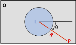 The next sketch is a top view of the plane and the lens. Our data have a coordinate origin, which can be anywhere but in computer screen convention is at the top left, marked O. Now we see the point L where the lens touches the plane; it's directly under V. Point P is distance R from L, and this line has angle θ from the x-axis of the data coordinate system.