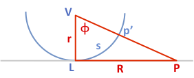 Switching to a side view sliced through the blue lens, we have the diagram we need to find the above-the-plane information. The lens is now just a blue semicircle (or parabola, or whatever shape we chose). The projection from P up to V passes through the lens at p', forming a right triangle with angle φ at V. That's about it: we know the coordinates of the points and the lengths r and R. If the lens is a hemisphere, the arc length s is just rφ.
