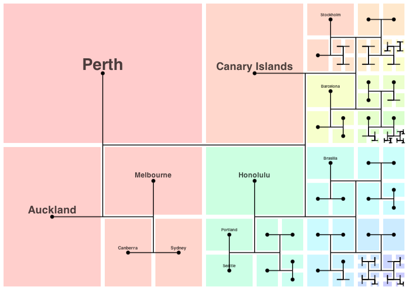 H-fractal in which the branches grow only as far as the data -- so some branches are short, and some are long (and so fold back on themselves, making a dense clump). Visually these seem more like treemaps: they're rectangular and make efficient use of space. It depends whether you focus on the colored boxes (like a treemap) or the black lines and dots (an H-fractal, thus a dendrogram). This